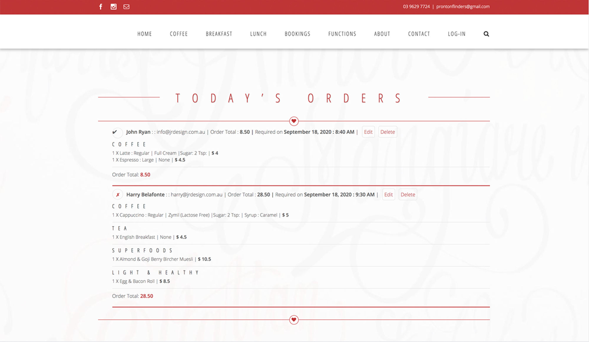 The Admin interface for the coffee/food ordering system. Completed orders were checked off, and could be managed as required.