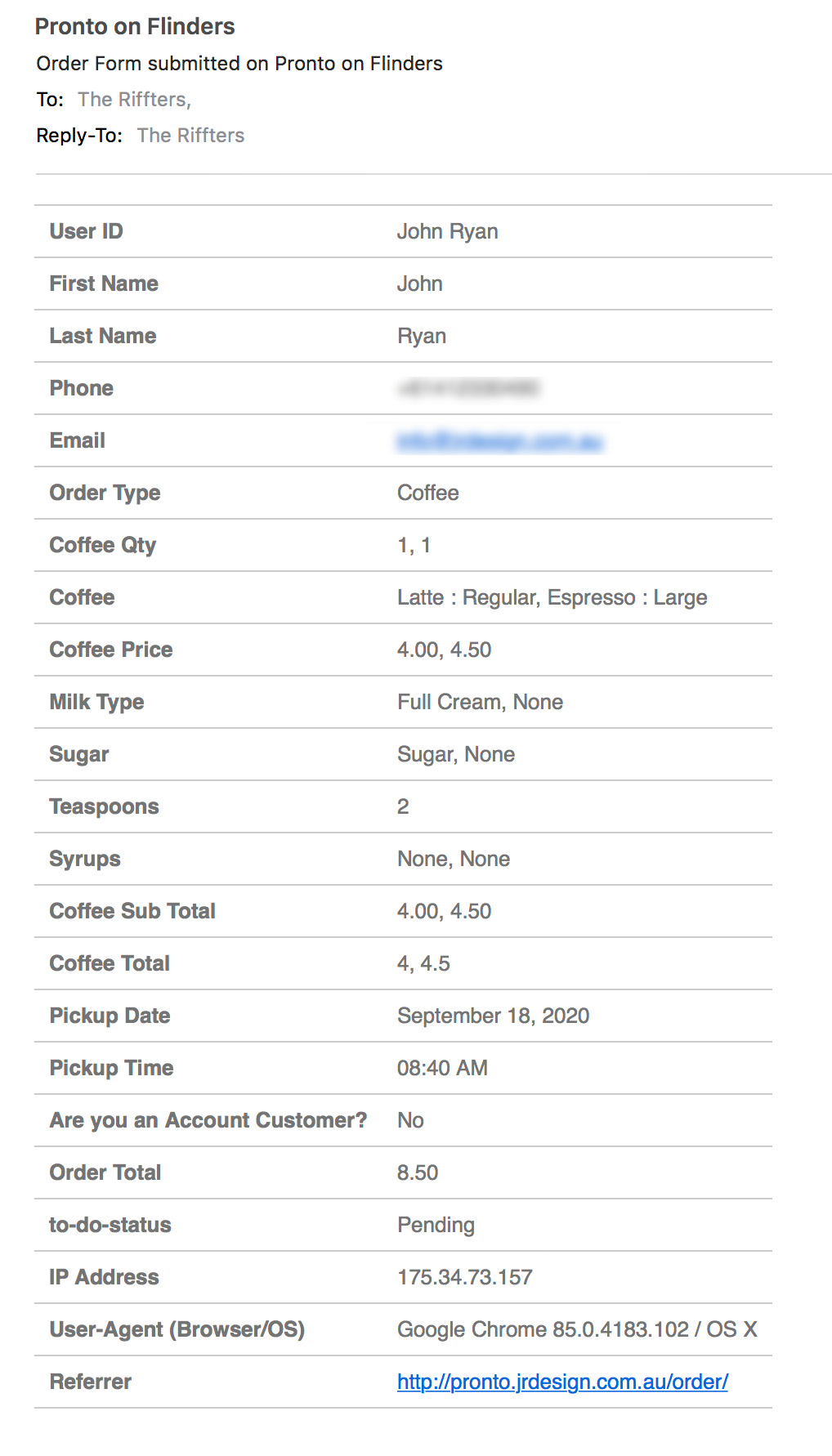 The customer order page. Dynamic values for charges easily managed in the Admin interface.